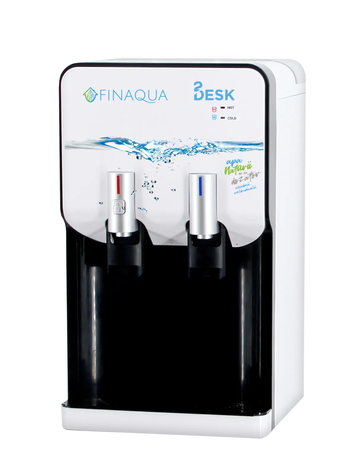 Designul său modern și filtrarea avansată asigură o integrare armonioasă în orice spațiu, oferindu-vă apă curată și sănătoasă. Cu opțiuni pentru apă rece sau caldă, Finaqua DESK aduce versatilitate și confort, contribuind la un stil de viață sănătos, eliminând necesitatea de a vă deplasa pentru a vă asigura de accesul constant la apă de calitate.